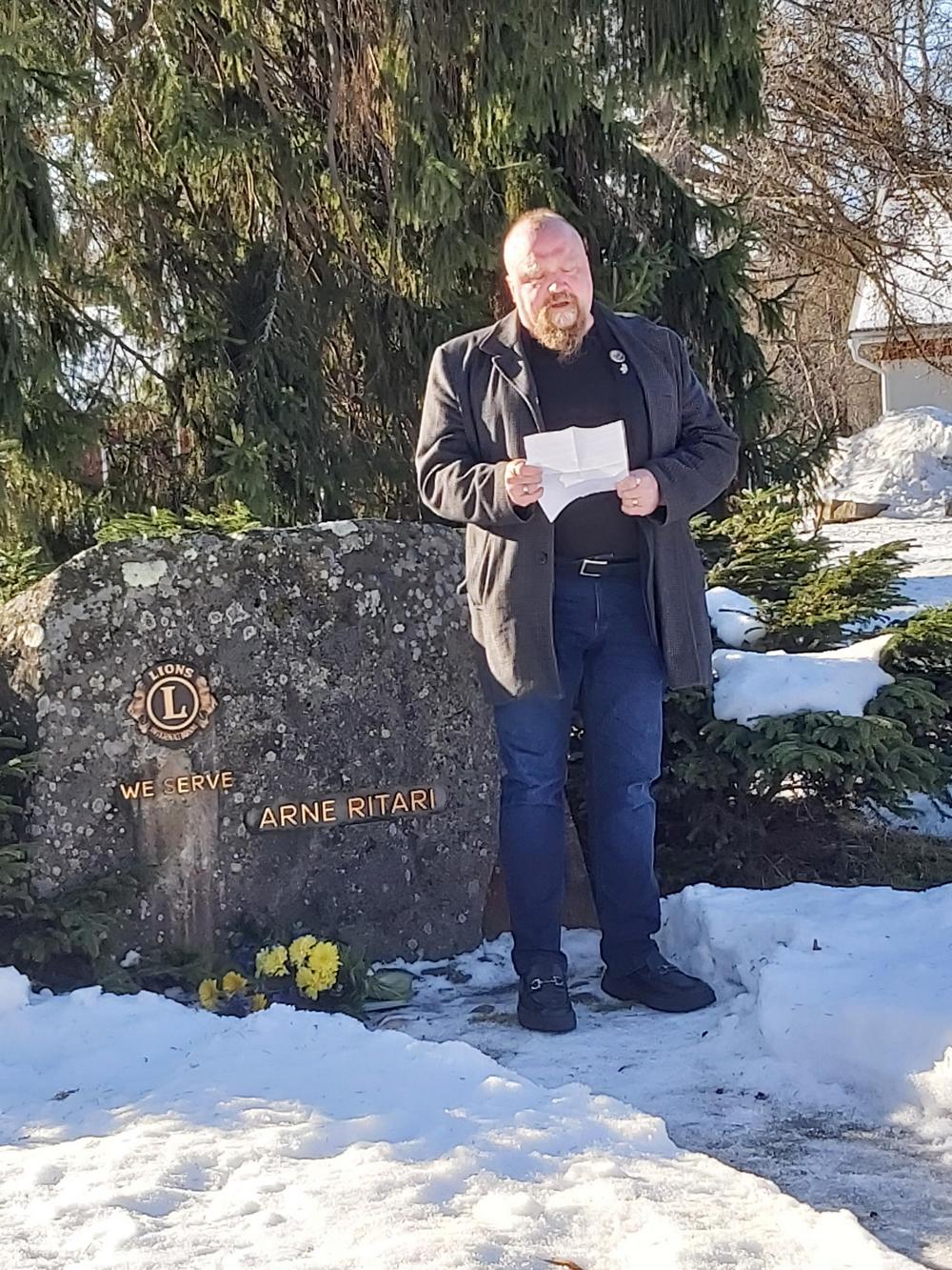Timo Santala muistutti, että Arne Ritarin syntymäpäivänä, maaliskuun seitsemäntenä päivänä, kivellä muistetaan järjestölle tärkeää henkilöä pienimuotoisesti.